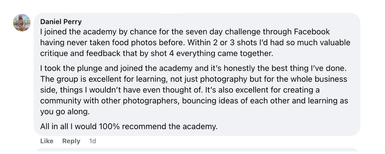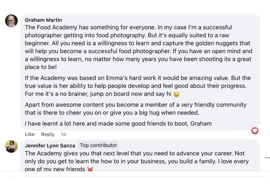 Here are 5 more reasons why joining the Food Photography Academy and THE STUDIO Facebook Group is the best decision you'll make for your career: